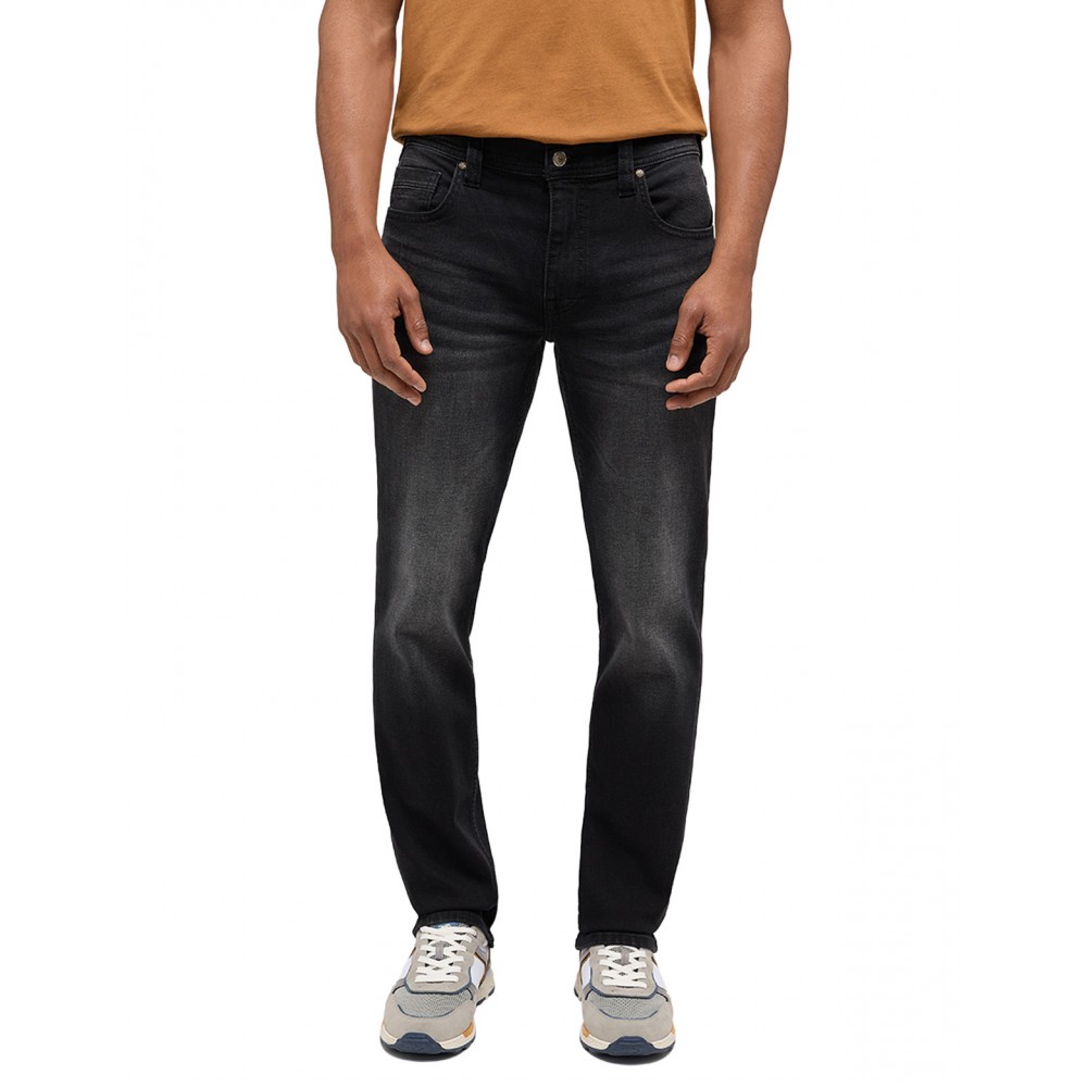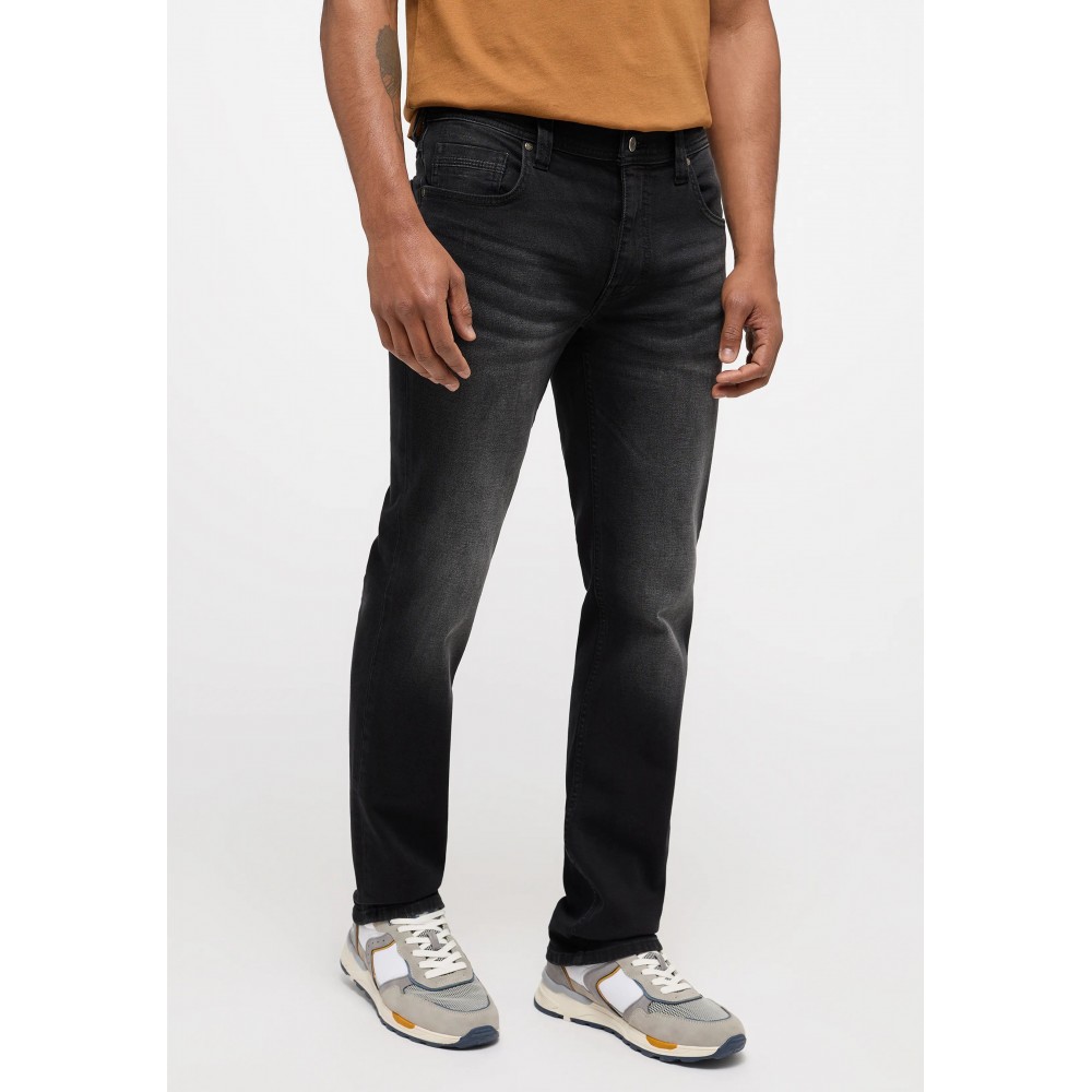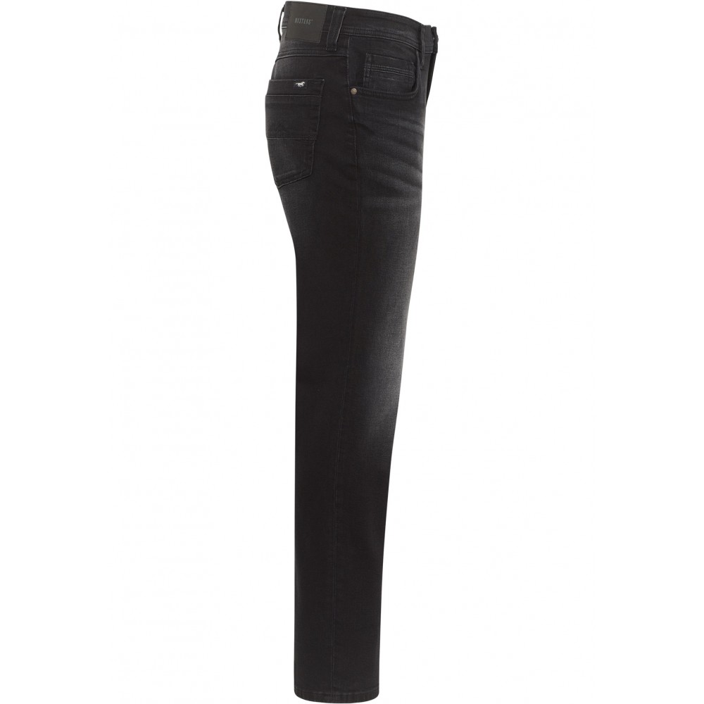 Pánské džíny Mustang, model Washington Straight. Černá barva s prvky lehkého ošoupání. Rovný střih přes boky a stehna, nohavice se od kolen dolů nezužují.