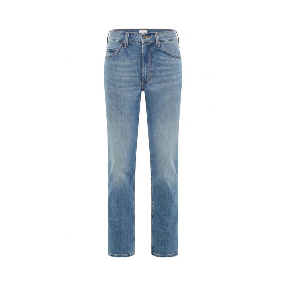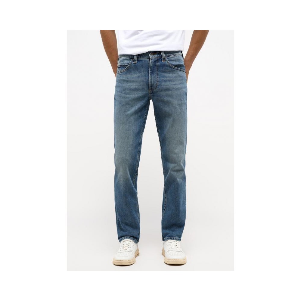 Pánské džíny značky Mustang. Model Tramper má střih SLIM FIT a rovné nohavice. Modrá barva s lehkými prvky vyšisování (oprání). Zapínání je na zip a knoflík.